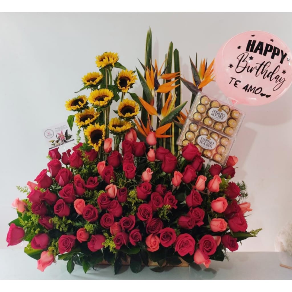 Rosas rojas, salmón, aves del paraíso,  girasoles, globo y  tarjeta